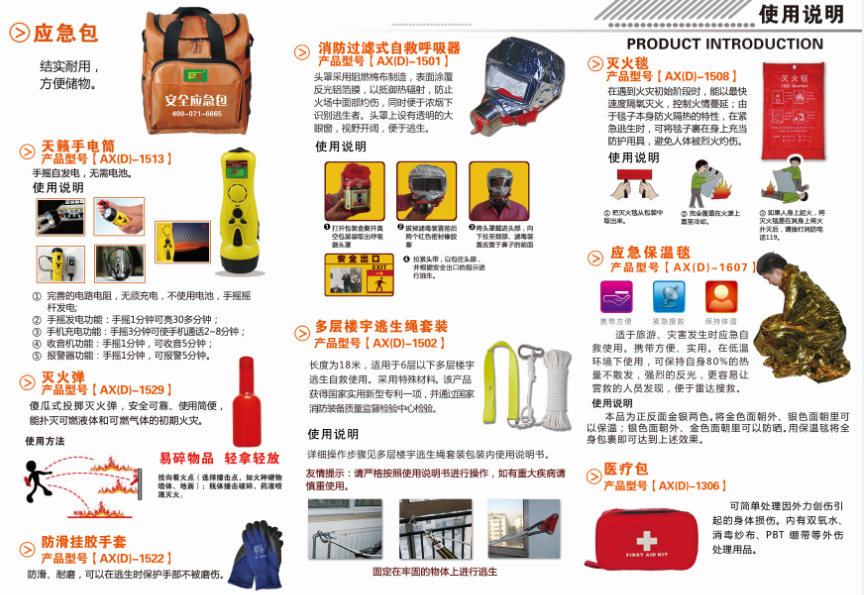 同時,消防應急包對于我們來說也是不可缺少的,應急包中的防毒面罩、緩降器、逃生繩、滅火彈、滅火毯、應急手電筒等在火災初期對于我們來說還是有幫助的,在火災萌芽時段能消滅火災對于我們個人來說也是非常重要的。