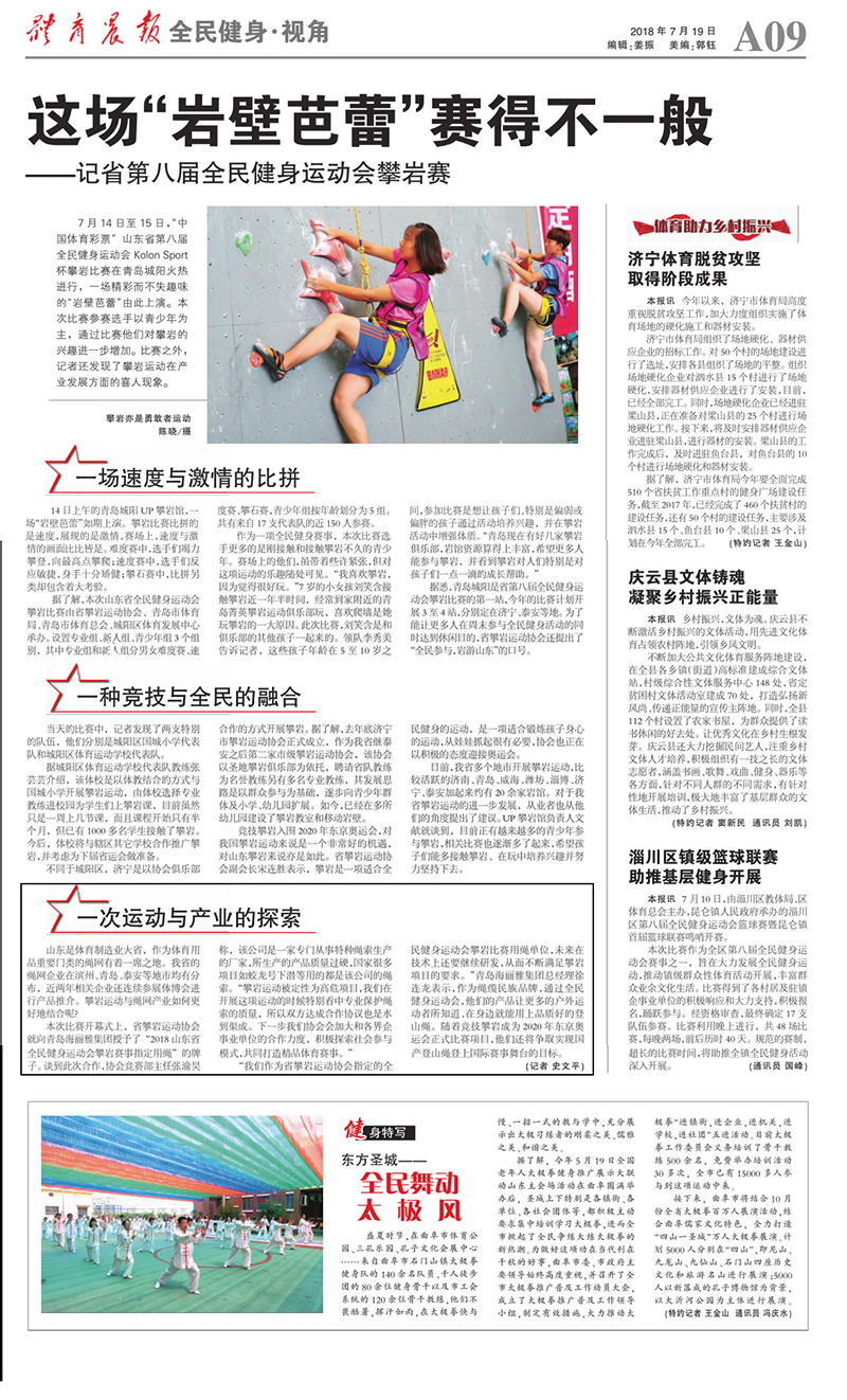 《體育晨報》以“這場巖壁芭蕾賽的不一般”為題,對公司研發(fā)生產(chǎn)的“蛟龍”動力繩成為2018山東省全民健身運(yùn)動會攀巖賽事唯一指定用繩等內(nèi)容進(jìn)行報道。