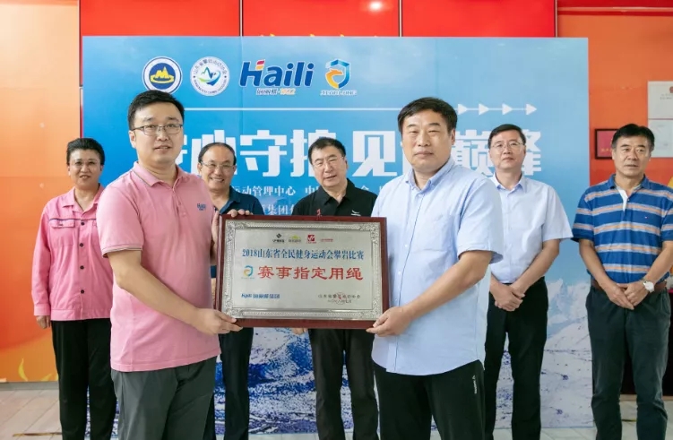 最后,山東省攀巖動員協會會長安慕雷為海麗雅集團授牌--山東省攀巖比賽指定用繩。
