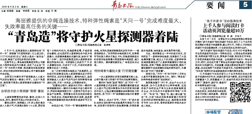 按照計(jì)劃,“天問一號(hào)”將于明年2月到達(dá)火星并開展著陸準(zhǔn)備等工作。屆時(shí),“青島造”的特種繩索將接受“實(shí)戰(zhàn)測試”。