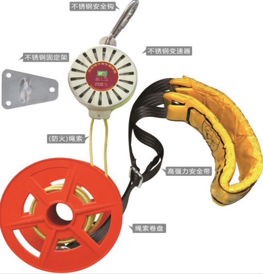1、防火逃生緩降器的繩索具有耐高溫性能,瞬時耐溫高達500 ℃。內由八股航空鋼絲外由進口凱夫拉包芯編織制成,耐磨性、防切割性能遠高于傳統產品;