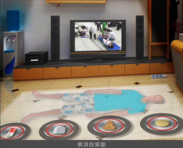 家居消防安全設(shè)備展示方式:通過(guò)地面投射的方式,展示一個(gè)不同程度燒傷的傷員,參觀者通過(guò)選擇不同的處理辦法,進(jìn)行傷員的虛擬救助。